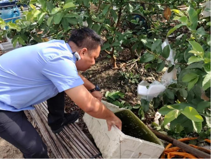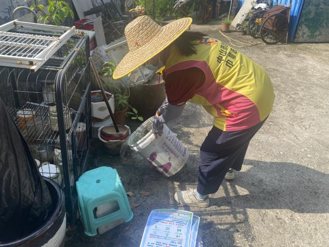 黨員突擊隊(duì)與居民志愿者組成“攻堅(jiān)小組”,帶著手套、掃帚逐個點(diǎn)位排查。入戶行動更顯細(xì)致:志愿者手把手教居民用“封、填、疏、排、清”五步法處理積水——水缸加蓋、洼地填平、溝渠疏通、托盤控水、垃圾清零,連美人蕉葉片的積水都不放過,從源頭斬?cái)辔孟x孳生路徑。