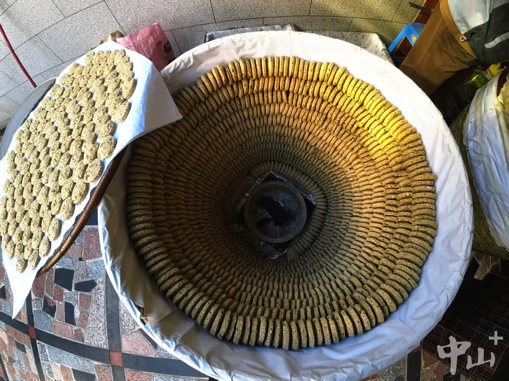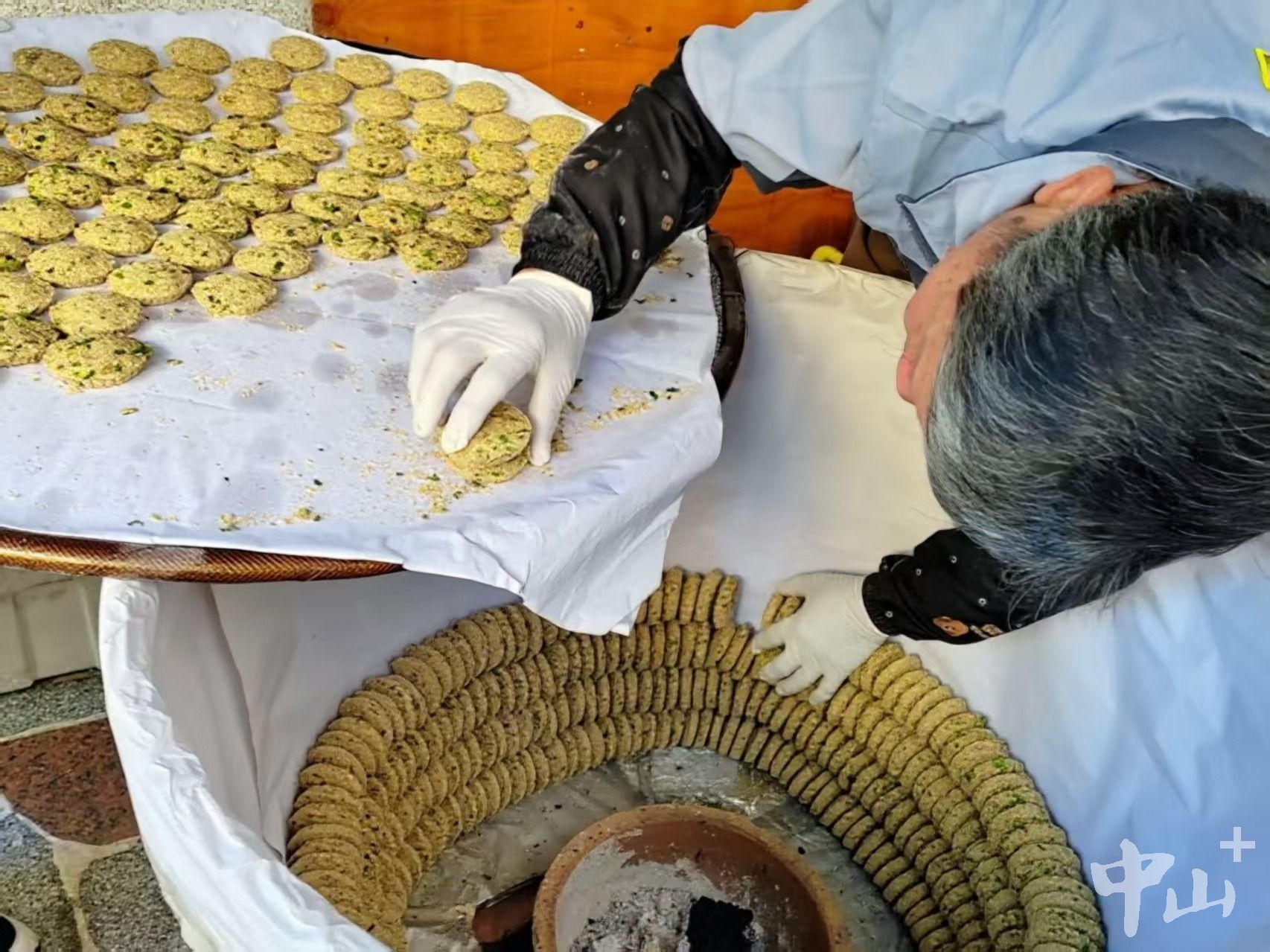 三個(gè)竹編的大烤爐里,底部木炭正在燃燒,壁沿上一個(gè)個(gè)炒米餅一層層整齊擺放著,散發(fā)出香味。每到臘月,陳秀明和家人就做炒米餅、油角和糖環(huán)等傳統(tǒng)食品。為了讓港澳同胞和周邊街坊等老熟客嘗到記憶中的年味,他10多年來堅(jiān)持純手工制作,保持著穩(wěn)定銷量。